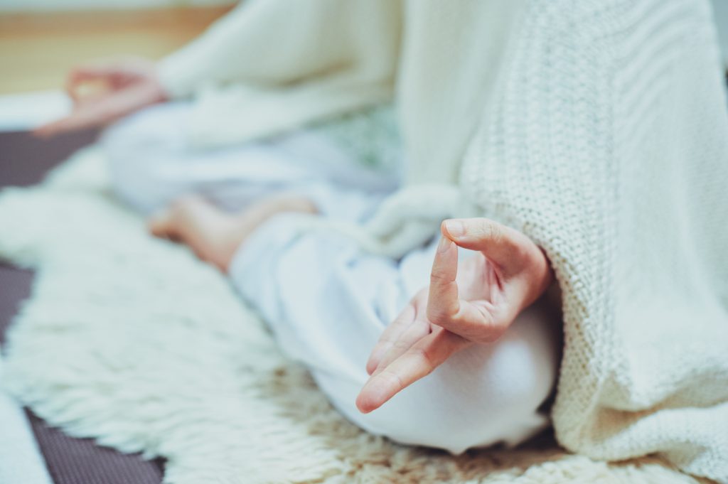 Siéntate con las piernas cruzadas. Aplica un ligero jalandhara banda (llevando la barbilla cerca del cuello) y coloca tus manos en postura de oración (juntando las palmas) sobre el esternón.